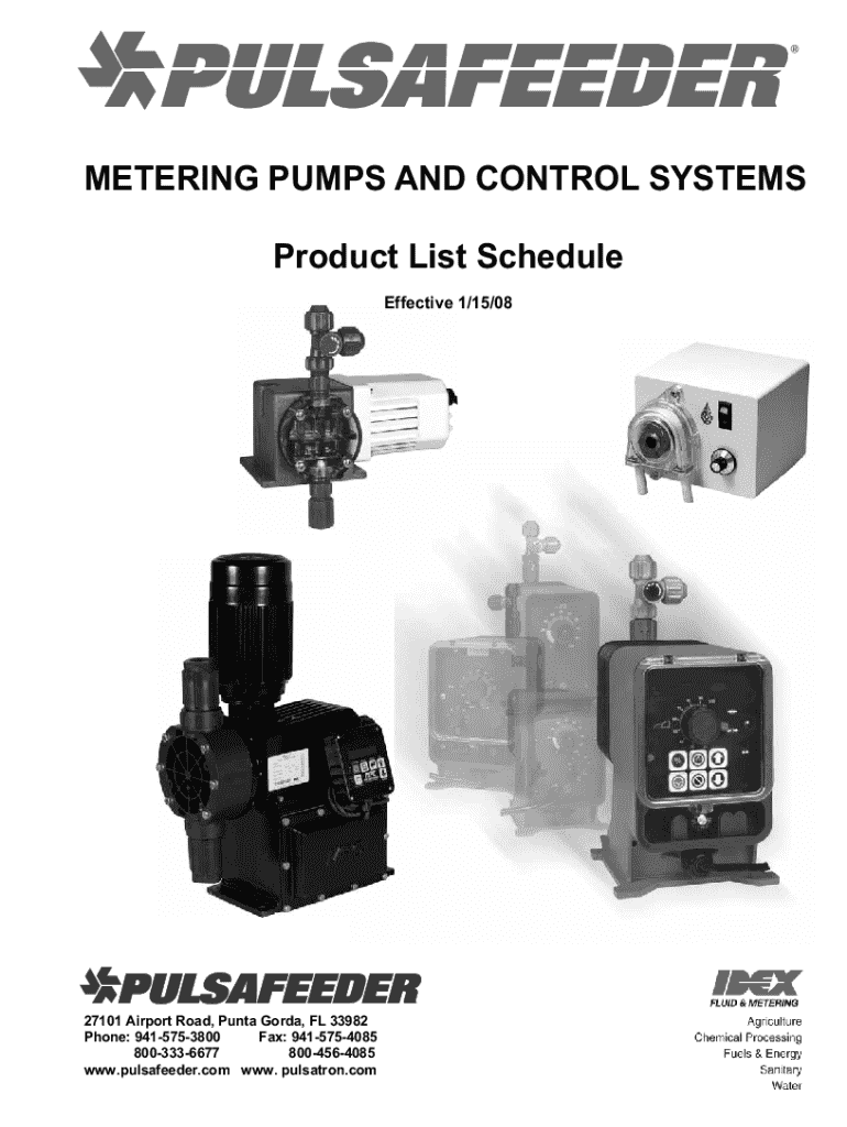 METERING PUMPS AND CONTROL SYSTEMS Product List Schedule Effective 1/15/0827101 Airport Road, Junta Golda, FL 33982 Phone: 9415753800 Fax: 9415754085 8003336677 8004564085 www.pulsafeeder.com WWW.