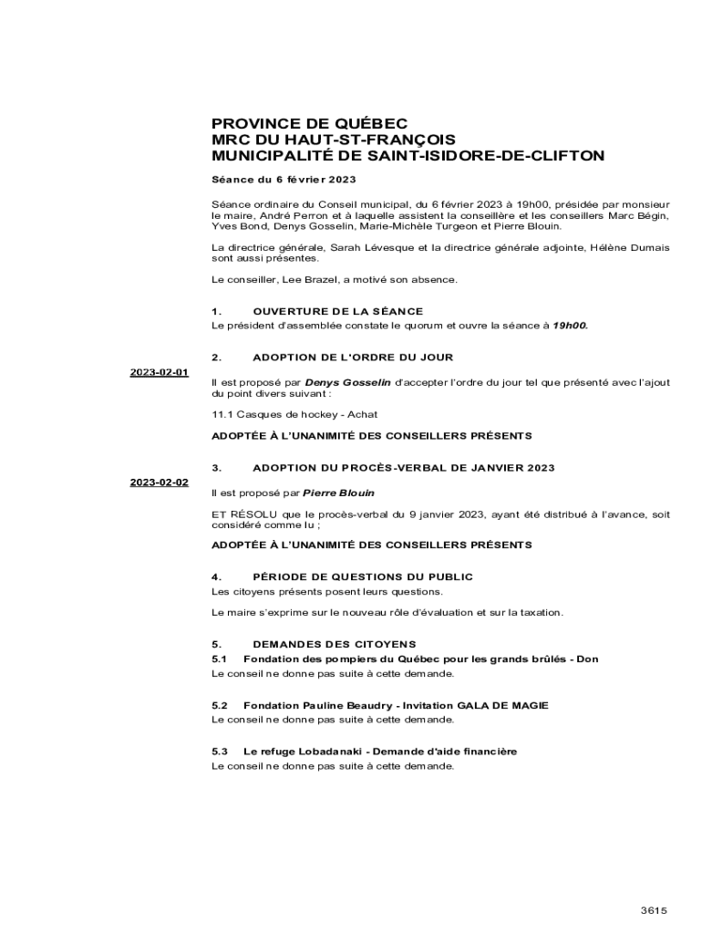 PROVINCE DE QUEBEC MRC DU HAUTSTFRANOIS MUNICIPALITY DE SAINTISIDOREDECLIFTON Since Du 6 frier 2023 Since ordinary Du Conrail municipal, Du 6 frier 2023 19h00, pride par monsieur LE Maine, And Person
