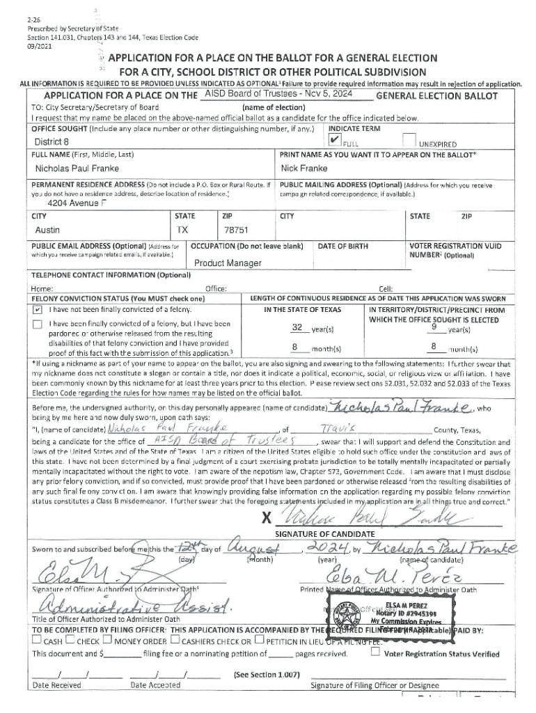 This document is the official application for candidates seeking a position on the AID Board of Trustees for the 2024 General Election. All required information must be provided.