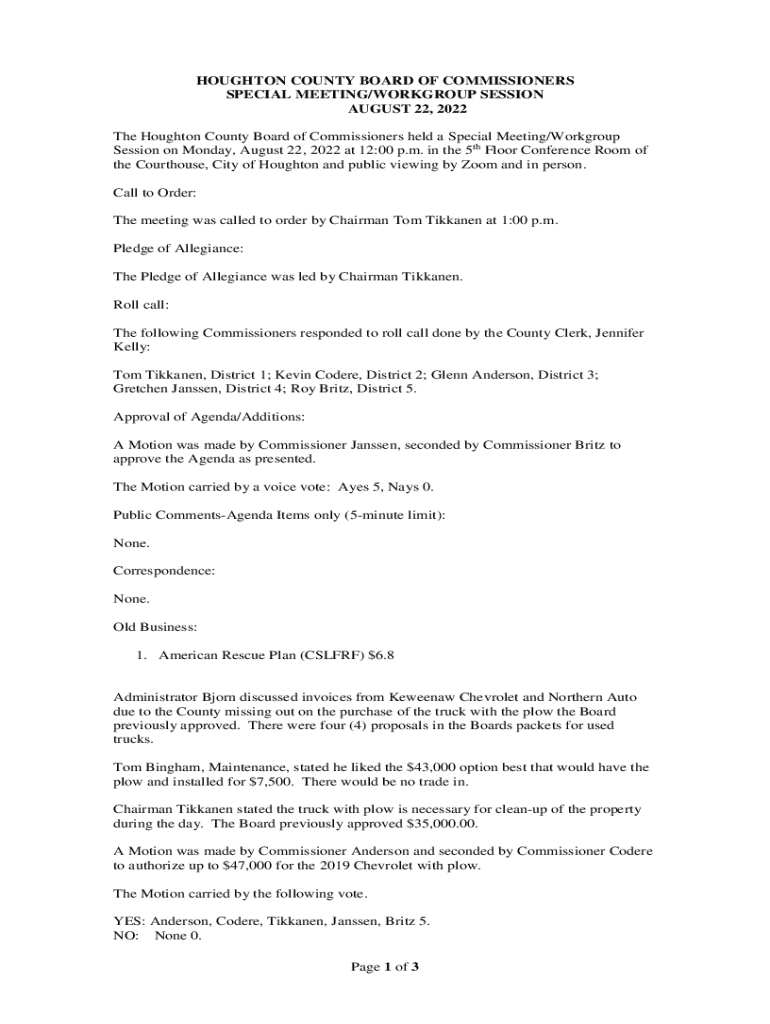 HOUGHTON COUNTY BOARD OF COMMISSIONERS SPECIAL MEETING/WORKGROUP SESSION AUGUST 22, 2022, The Houghton County Board of Commissioners held a Special Meeting/Workgroup Session on Monday, August 22,