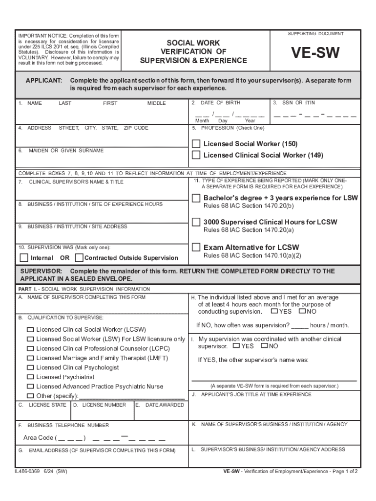 Complete the VE-SW form to verify supervised experience for Illinois social work licensure. Ensure compliance with state rules for consideration.