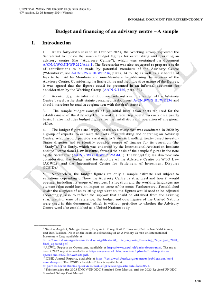 INFORMAL DOCUMENT FOR REFERENCE ONLYBudget and financing of an advisory center A sample