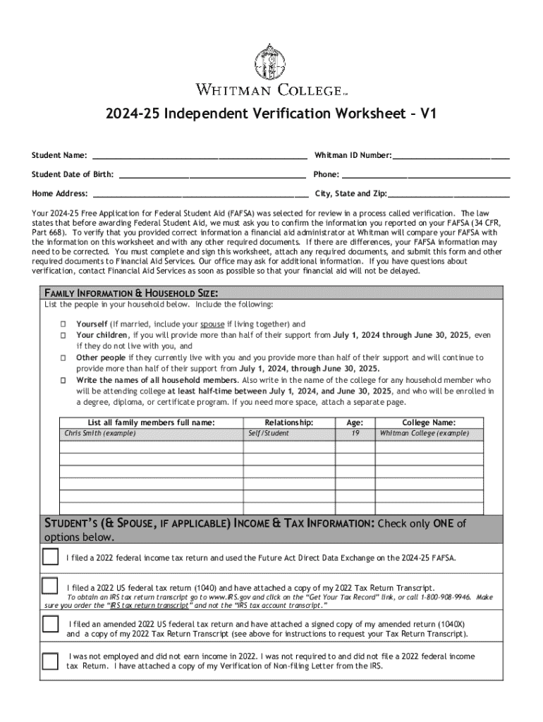 Complete the 2024-25 Independent Verification Worksheet to verify FAFSA information and ensure eligibility for Federal Student Aid at Whitman College.