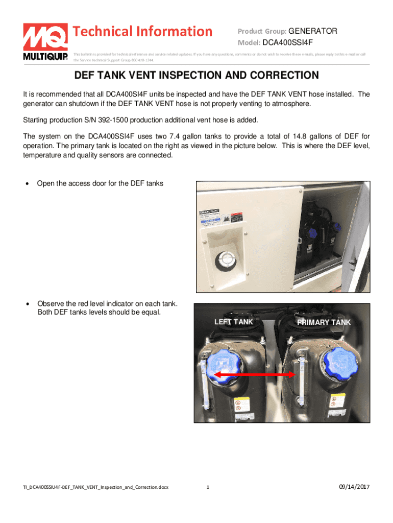 Technical InformationProduct Group: GENERATOR Model: DCA400SSI4FThis bulletin is provided for technical reference and service related updates. If you have any questions, comments or do not wish to