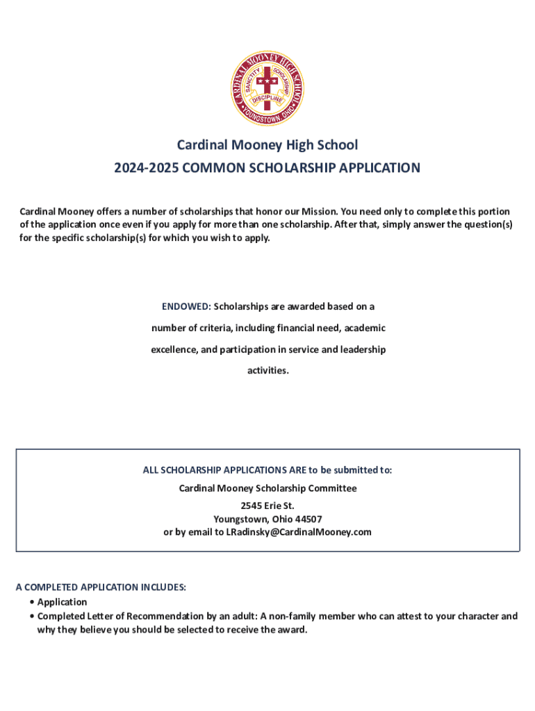 Apply for the Cardinal Mooney Scholarships for 2024-2025. Complete the application and provide recommendation letters to honor academic achievements and leadership.