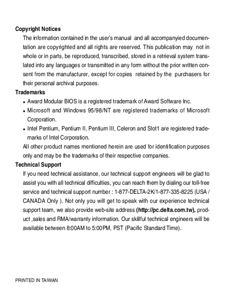 Copyright Notices The information contained in the users manual and all accompanyied documentation are copyrighted and all rights are reserved. This publication may not in whole or in parts, be reproduced, transcribed, stored in a retrieval system translated into any languages or transmitted in any form without the prior written consent from the manufacturer, except for copies retained by the purchasers for their personal archival purposes. Trademarks Award Modular BIOS is a registered...