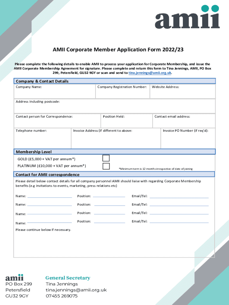 AMII Corporate Member Application Form 2022/23 Please complete the following details to enable AMII to process your application for Corporate Membership, and issue the AMII Corporate Membership Agreement