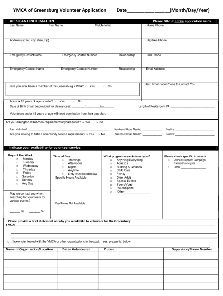 Complete the YMCA of Greensburg Volunteer Application to get involved, providing essential personal info, availability, and volunteering interests.