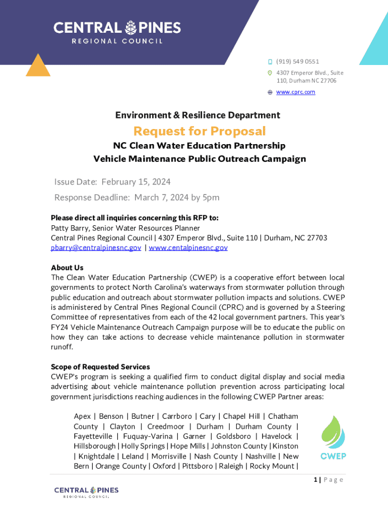 (919) 549 0551 4307 Emperor Blvd., Suite 110, Durham NC 27706 www.cprc.comEnvironment & Resilience DepartmentRequest for Proposal NC Clean Water Education Partnership Vehicle Maintenance Public Outreach