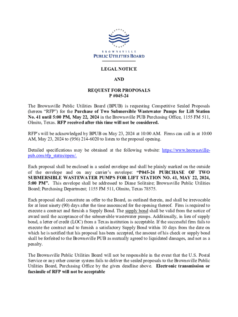 The Brownsville PUB is seeking sealed proposals for two submersible wastewater pumps for Lift Station No. 41, due by May 22, 2024. Detailed specs and requirements provided.
