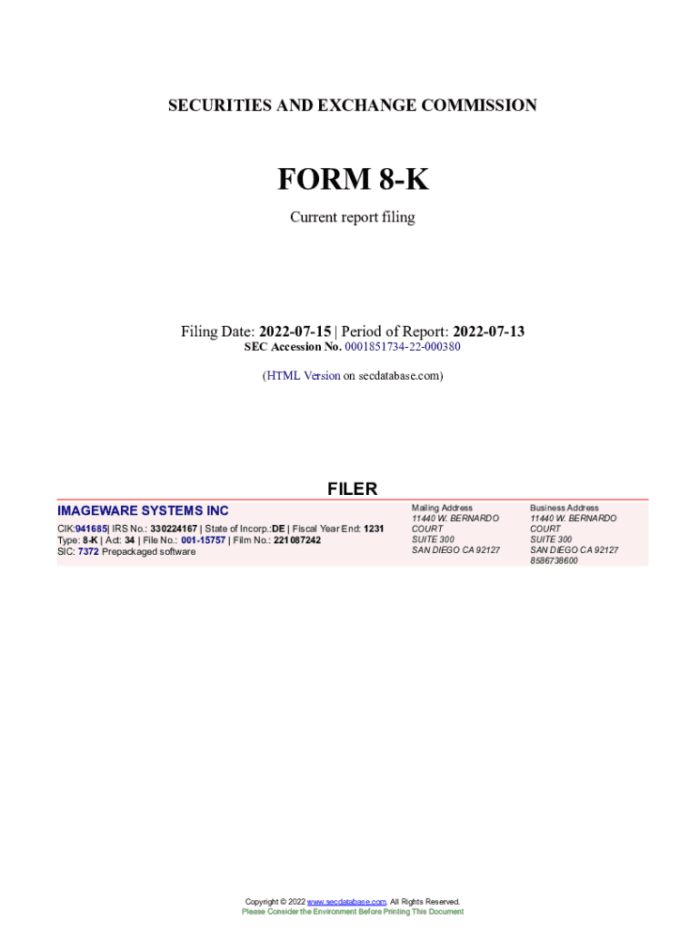 Review the latest current report (Form 8-K) from ImageWare Systems Inc., detailing crucial financial agreements and corporate changes from July 2022.