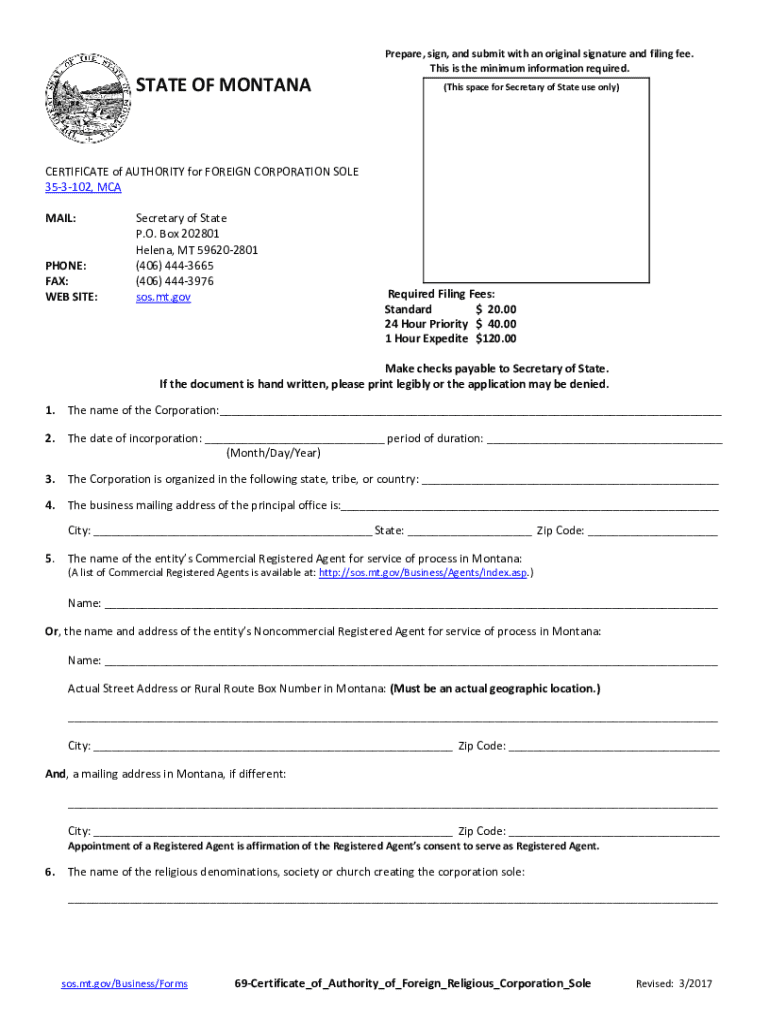 Complete the Certificate of Authority for a Foreign Corporation Sole in Montana, including details on incorporation, registered agents, and required fees.