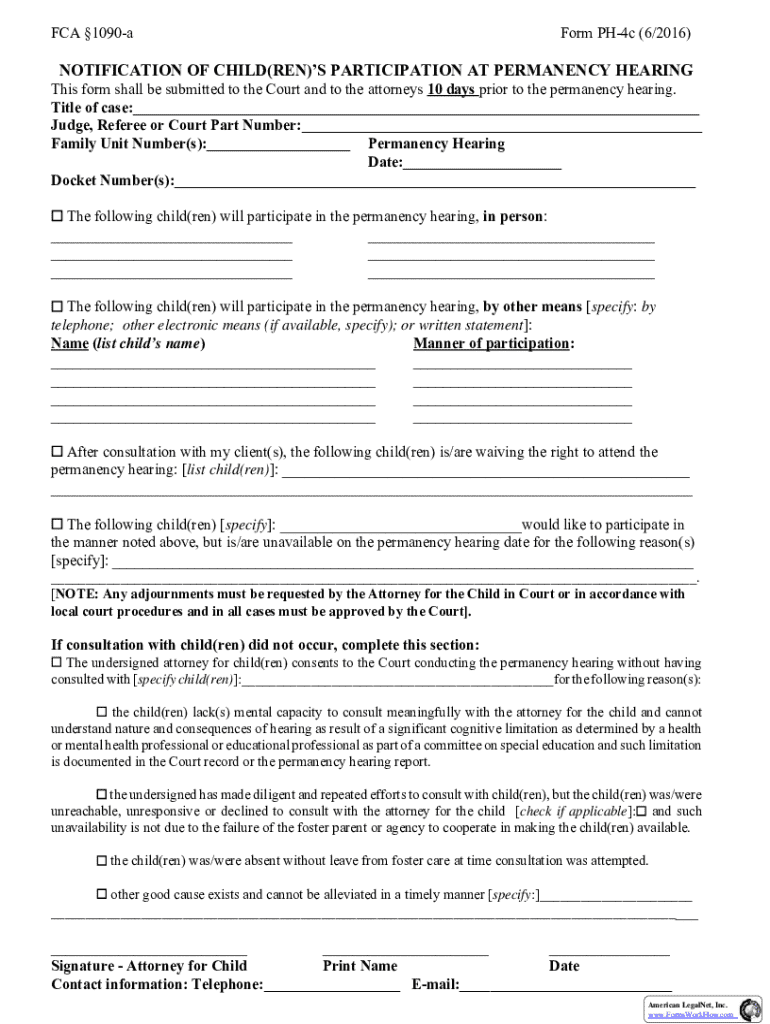 FCA 1090aForm PH4c (6/2016)NOTIFICATION OF CHILD(REN’S PARTICIPATION AT PERMANENCY HEARING This form shall be submitted to the Court and to the attorneys 10 days prior to the permanency hearing.