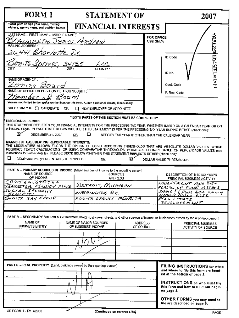 This document is a comprehensive financial interests disclosure form for candidates and employees, detailing income sources, liabilities, and other financial interests in the year 2007.