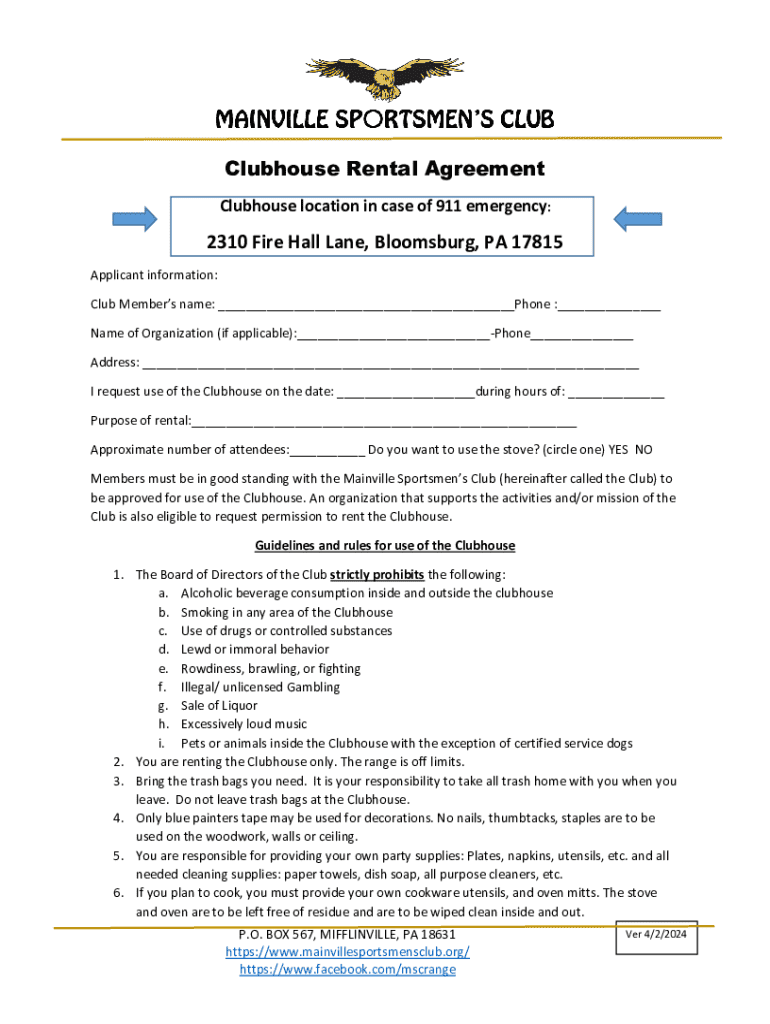 Clubhouse Rental Agreement Clubhouse location in case of 911 emergency:2310 Fire Hall Lane, Bloomsburg, PA 17815 Applicant information: Club Members name: ___Phone :___ Name of Organization (if applicable):___Phone___