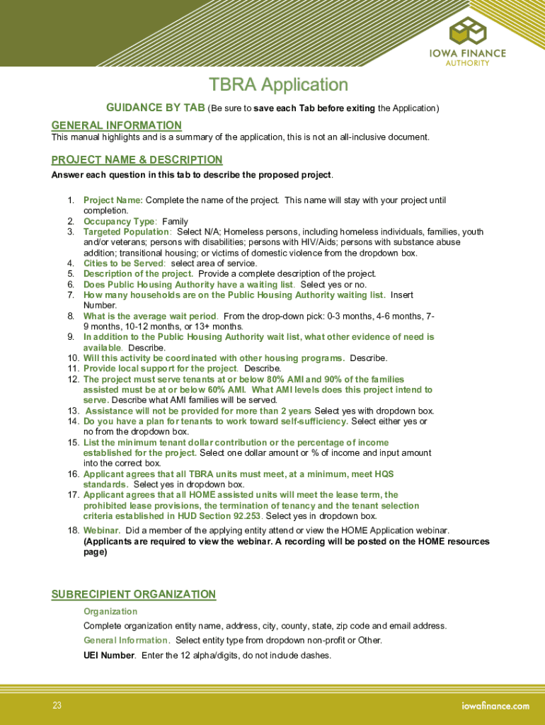 TBRA Application GUIDANCE BY TAB (Be sure to save each Tab before exiting the Application) GENERAL INFORMATION This manual highlights and is a summary of the application, this is not an allinclusive
