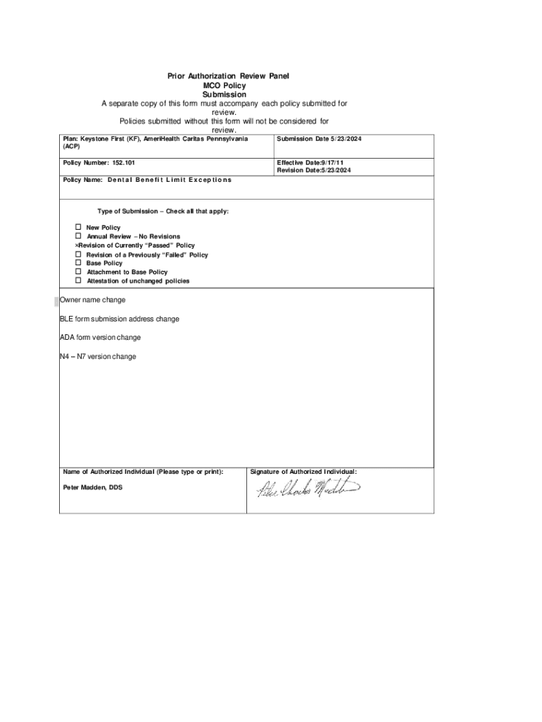 Prior Authorization Review Panel MCO Policy Submission A separate copy of this form must accompany each policy submitted for review. Policies submitted without this form will not be considered for