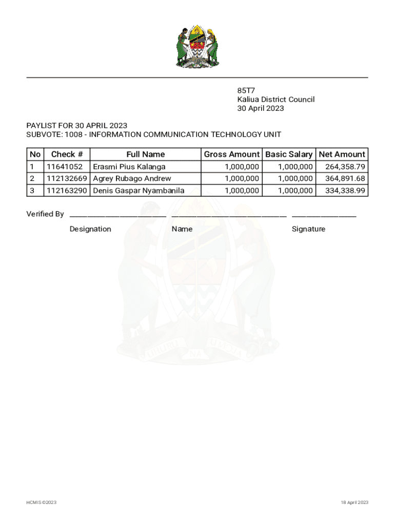 85T7 Kailua District Council 30 April 2023 PLAYLIST FOR 30 APRIL 2023 OUTVOTE: 1008 INFORMATION COMMUNICATION TECHNOLOGY UNITNoCheck #Full Name111641052Erasmi Pius Kalanga2 3Gross Amount Basic Salary