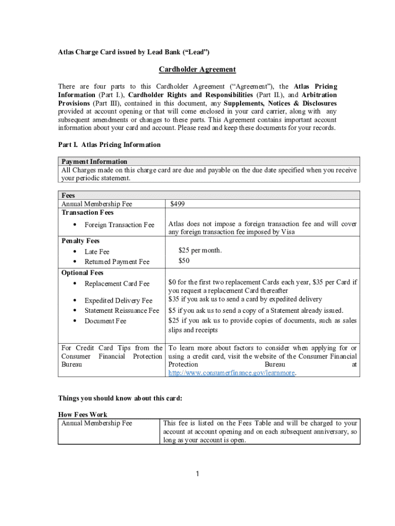 Atlas Charge Card issued by Lead Bank (Lead)Cardholder Agreement There are four parts to this Cardholder Agreement (Agreement), the Atlas Pricing Information (Part I.), Cardholder Rights and Responsibilities