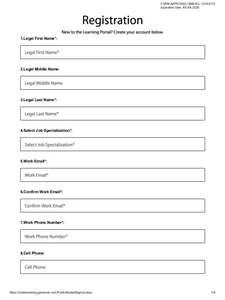 FORM APPROVED OMB NO. 12180172 Expiration Date: XXXX2026Registration New to the Learning Portal? Create your account below. 1. Legal First Name*:Legal First Name* 2. Legal Middle Name:Legal Middle