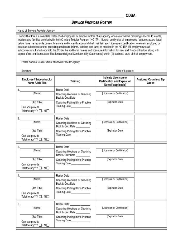 CDSA SERVICE PROVIDER ROSTER Name of Service Provider Agency I certify that this is a complete roster of all employees or subcontractors of my agency who are or will be providing services to infants,