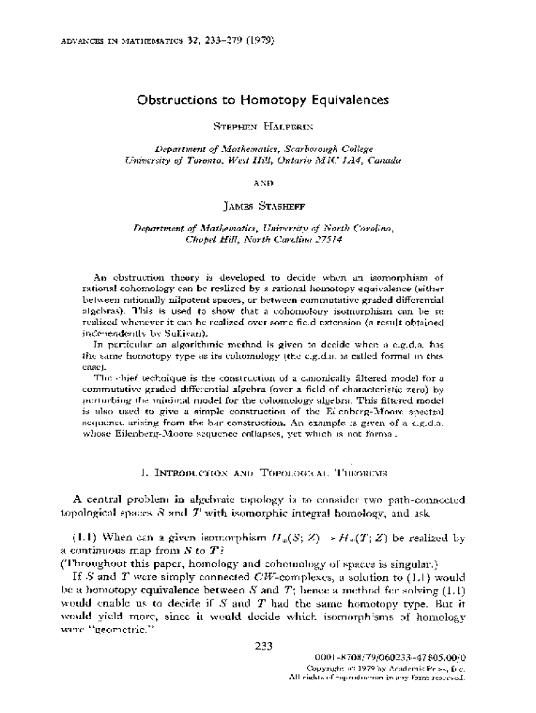 ADVANCESINYIATHEMATICS32, 233279Obstructions(1979)to Homotopy STEPIENDefmrtmnt U&ersityEquivalencesHALPERIKof Mathematics, West Hill,of Tormto,Scarborough Ontario MICCollege 1114, CanadaANDJAMESSTASHEFFrln obstruction theory is developed to decide when an isomarphism of rational cohomology can be reaked by a rational homotopy equivalence (either between rationally nilpotent spaces, or between commutative graded differential algebras). This is used to show that
