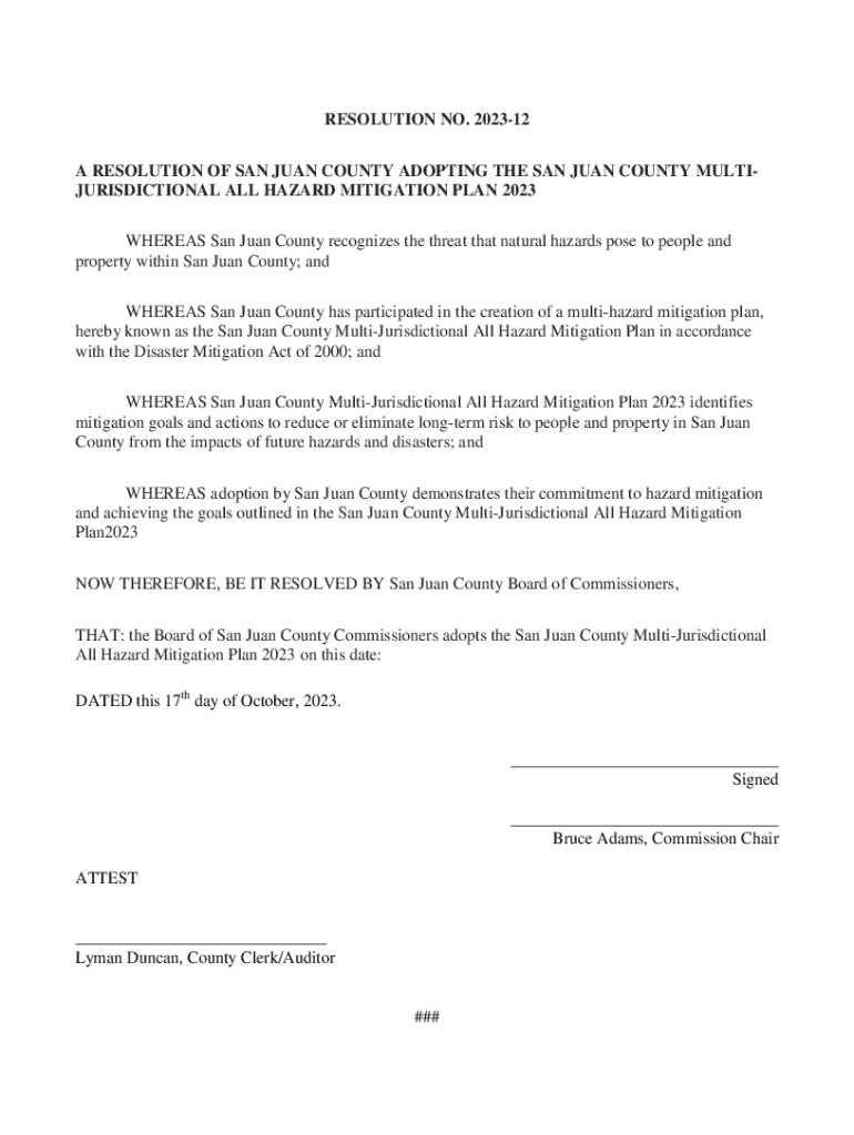 This resolution adopts the San Juan County Multi-Jurisdictional All Hazard Mitigation Plan 2023, highlighting actions to reduce risks from natural hazards.