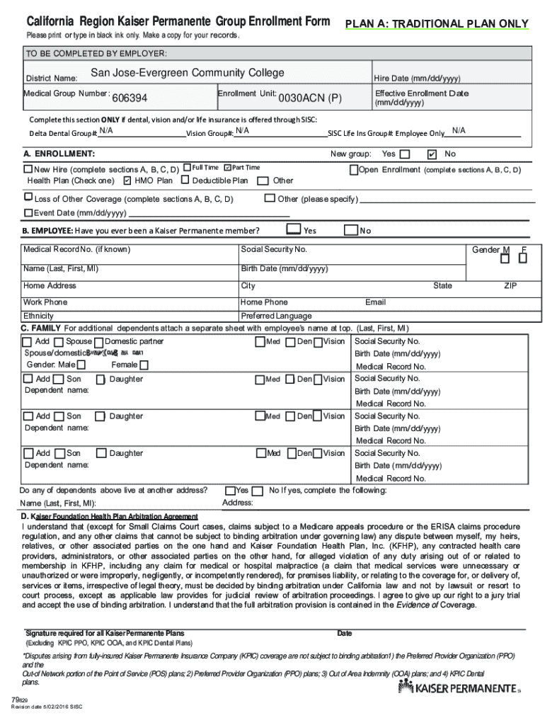 PLAN A: TRADITIONAL PLAN ONLYCalifornia Region Kaiser Permanente Group Enrollment Form Please print or type in black ink only. Make a copy for your records. TO BE COMPLETED BY EMPLOYER: District Name:San