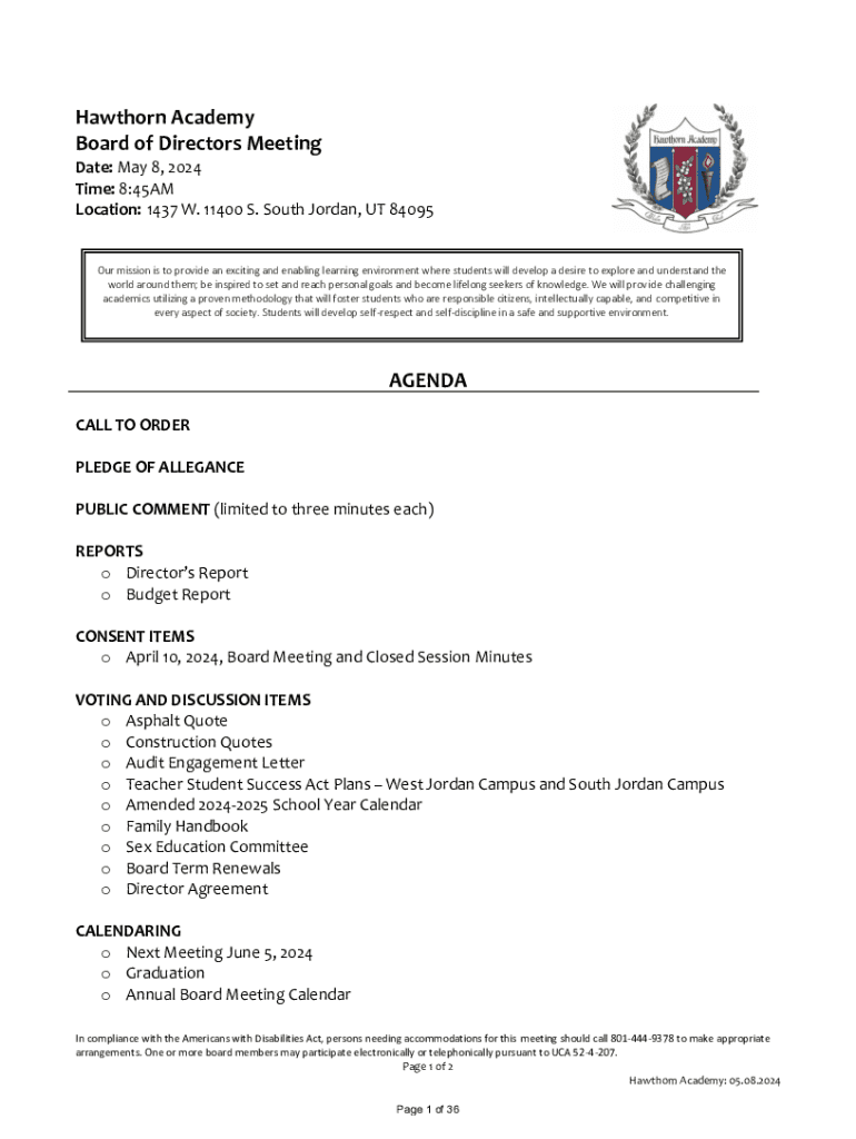 Hawthorn Academy Board of Directors Meeting Date: May 8, 2024 Time: 8:45AM Location: 1437 W. 11400 S. South Jordan, UT 84095Our mission is to provide an exciting and enabling learning environment where students will develop a desire to explore and understand the world around them; be inspired to set and reach personal goals and become lifelong seekers of knowledge. We will provide challenging academics utilizing a proven methodology that will foster students who are responsible citizens,...