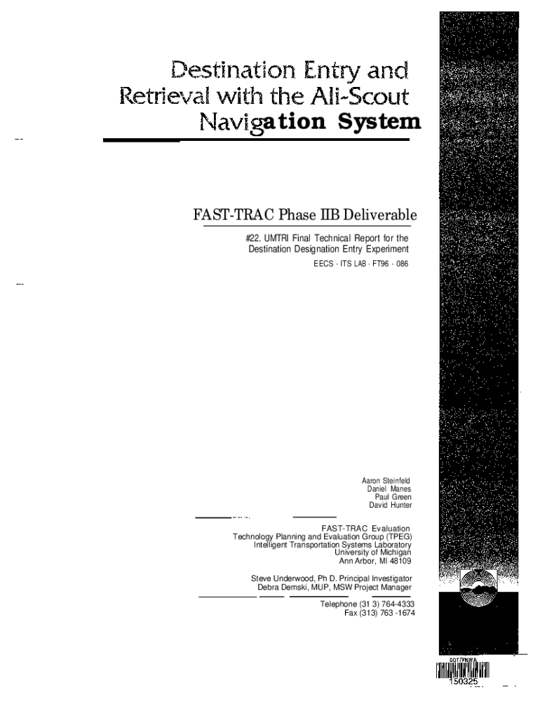 ation SystemFASTTRAC Phase IIB Deliverable #22. UMTRI Final Technical Report for the Destination Designation Entry Experiment EECS ITS LAB FT96 086Aaron Steinfeld Daniel Manes Paul Green David HunterFASTTRAC Evaluation Technology Planning and Evaluation Group (TPEG) Intelligent Transportation Systems Laboratory University of Michigan Ann Arbor, MI 48109 Steve Underwood, Ph D. Principal Investigator Debra Demski, MUP, MSW Project Manager Telephone (31 3) 7644333 Fax (313) 763 1674Technical