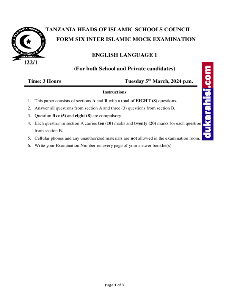TANZANIA HEADS OF ISLAMIC SCHOOLS COUNCIL FORM SIX INTER ISLAMIC MOCK EXAMINATION ENGLISH LANGUAGE 1122/1 (For both School and Private candidates) Tuesday 5th March, 2024 p.m.Time: 3 HoursInstructions
