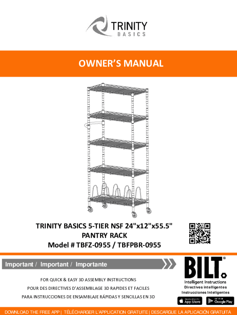 Comprehensive owner\'s manual for the TRINITY Basics 5-Tier Pantry Rack, including assembly instructions, warnings, and warranty details.