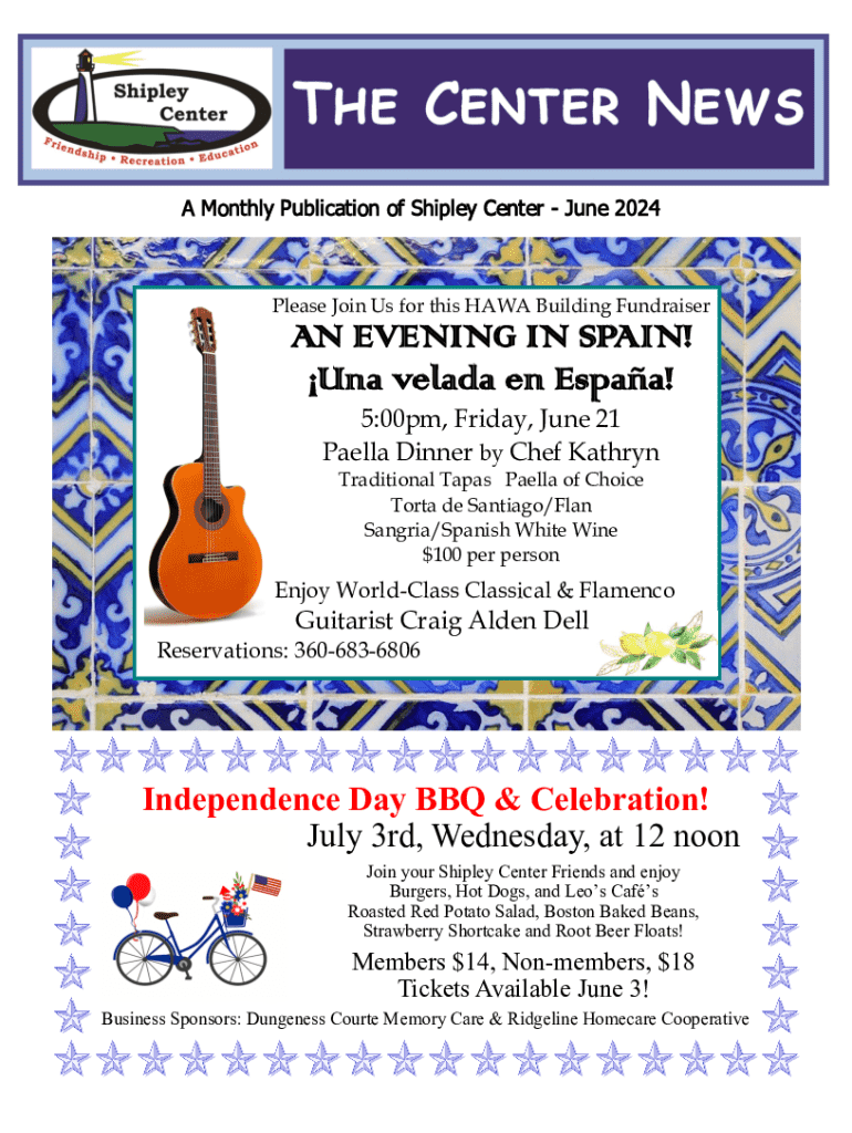 SHIPLEY CENTERThe Center NewsPAGEJUNE 2024A Monthly Publication of Shipley Center June 2024Please Join Us for this HAWA Building FundraiserAN EVENING IN SPAIN! Una velada en Espaa! 5:00pm, Friday,