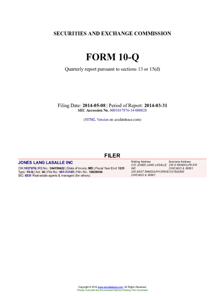 Get the free JONES LANG LASALLE INC Form 10-Q Quarterly Report Filed 2014-05-08. Accession Number