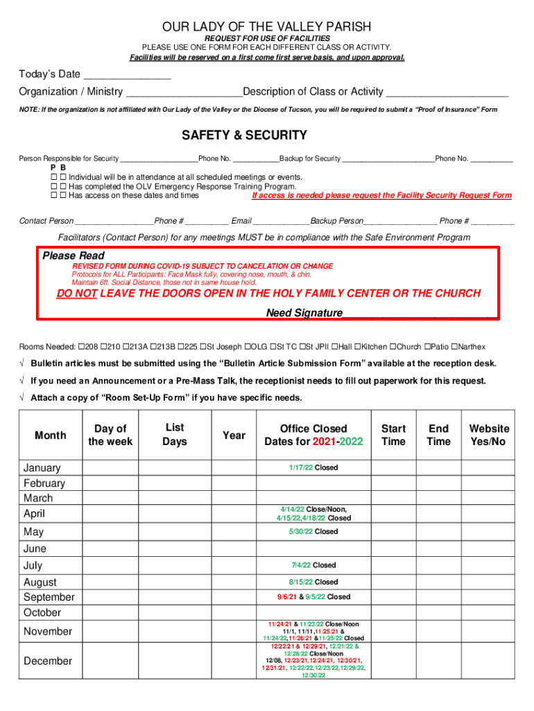 OUR LADY OF THE VALLEY PARISH REQUEST FOR USE OF FACILITIES PLEASE USE ONE FORM FOR EACH DIFFERENT CLASS OR ACTIVITY. Facilities will be reserved on a first come first serve basis, and upon approval.Todays