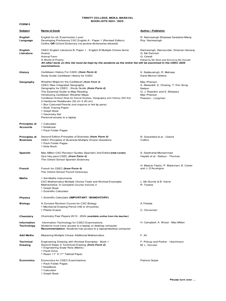 TRINITY COLLEGE, MOKA, MARAVAL BOOKLISTS 2024 / 2025 FORM 5 SubjectName of bookAuthor / PublisherEnglish LanguageEnglish for all: Examination Level Developing Proficiency CXC English A Paper 1 (Revised
