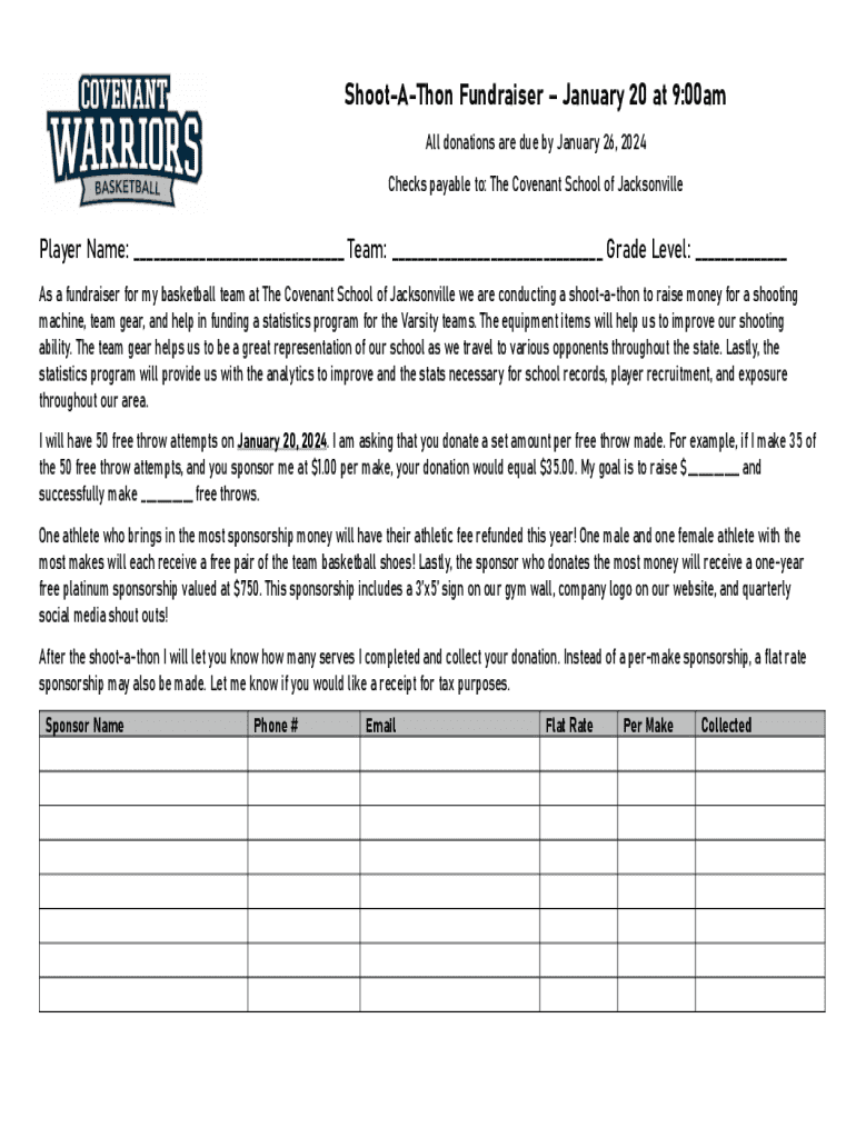Checks payable to: The Covenant School of JacksonvillePlayer Name: ___ Team: ___ Grade Level: ___