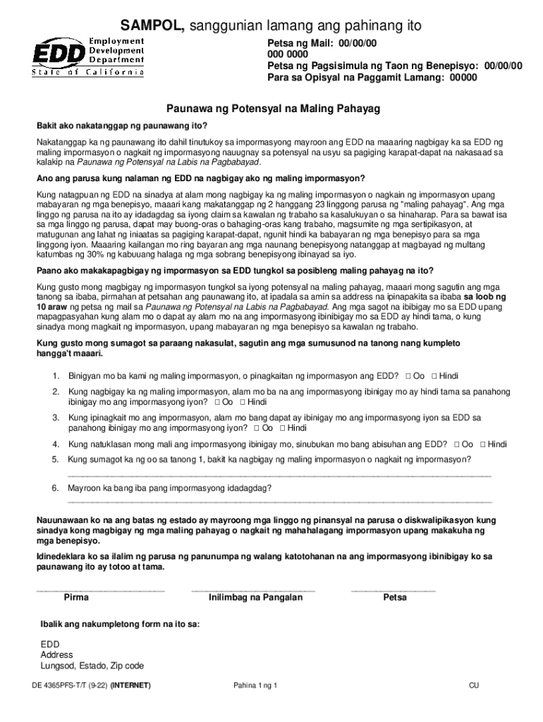 Get the free Paunawa ng Potensyal na Maling Pahayag (DE 4365PFS-T/T) Rev. (9-22) (INTERNET) Tagal...