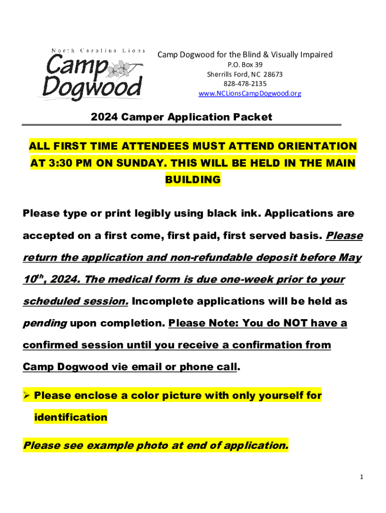 Camp Dogwood for the Blind & Visually Impaired P.O. Box 39 Sherrills Ford, NC 28673 8284782135 www.NCLionsCampDogwood.org2024 Camper Application Packet ALL FIRST TIME ATTENDEES MUST ATTEND ORIENTATION