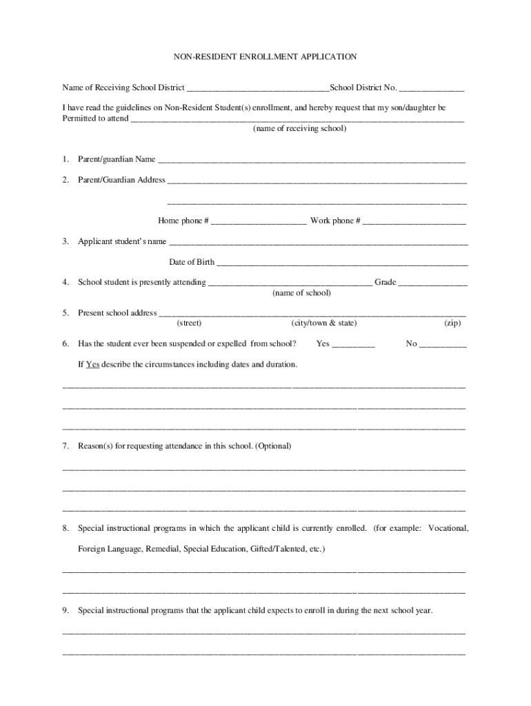 Apply for non-resident enrollment in a school district with this application. Provide student details, educational history, and reason for transfer.
