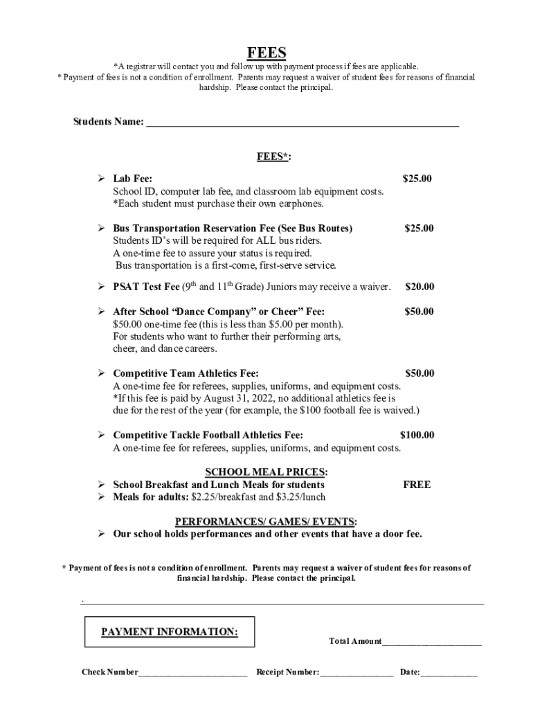 FEES *A registrar will contact you and follow up with payment process if fees are applicable. * Payment of fees is not a condition of enrollment. Parents may request a waiver of student fees for reasons