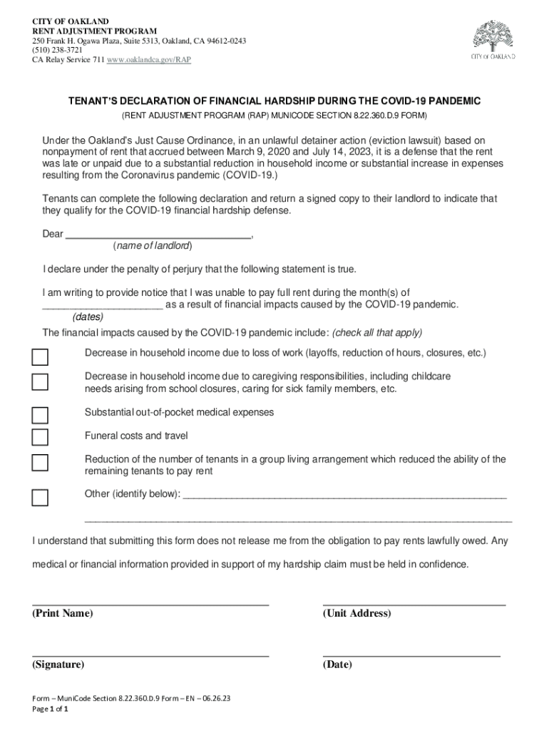 CITY OF OAKLAND RENT ADJUSTMENT PROGRAM 250 Frank H. Ogawa Plaza, Suite 5313, Oakland, CA 946120243 (510) 2383721 CA Relay Service 711 www.oaklandca.gov/RAPTENANTS DECLARATION OF FINANCIAL HARDSHIP