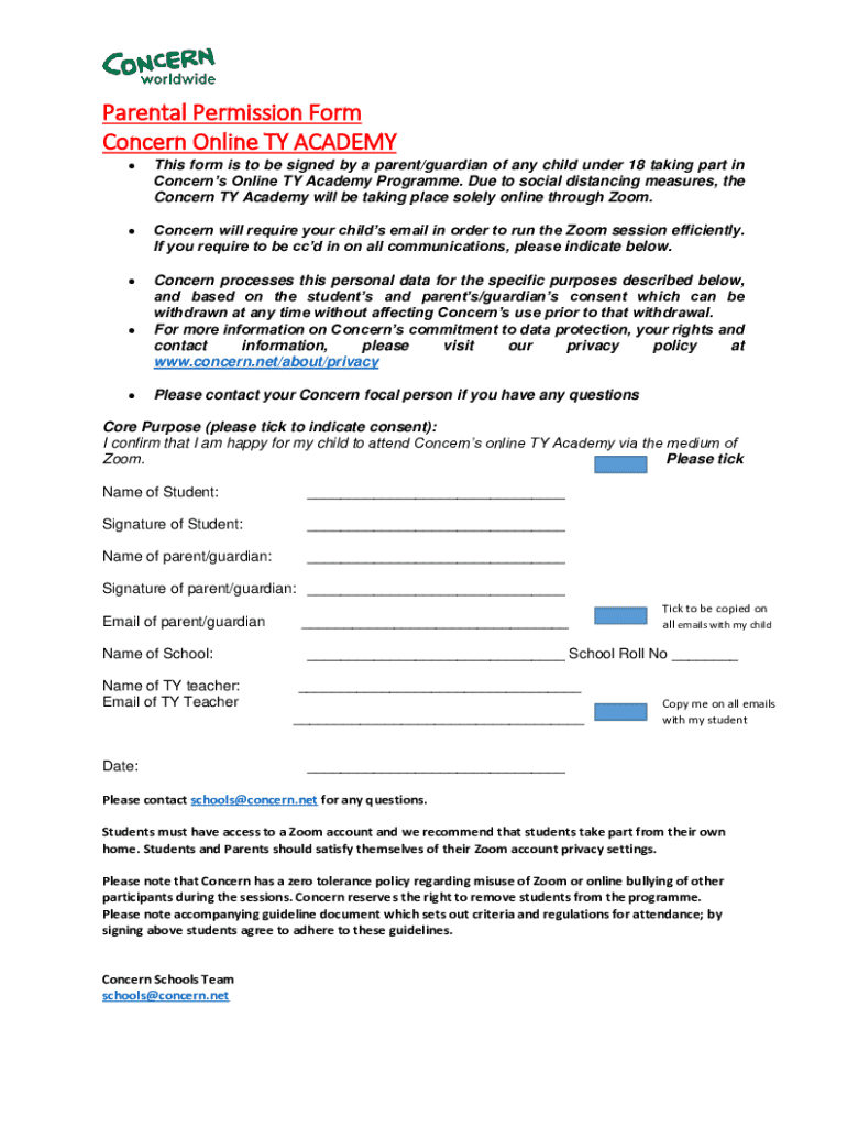 Sign the parental permission form for your child to participate in the Concern Online TY Academy Programme via Zoom. Ensure data protection and consent guidelines are followed.