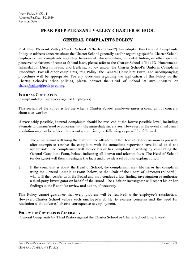 Board Policy #: SS 11 Adopted/Ratified: 4/2/2020 Revision Date:PEAK PREP PLEASANT VALLEY CHARTER SCHOOL GENERAL COMPLAINTS POLICY Peak Prep Pleasant Valley Charter School (Charter School) has adopted