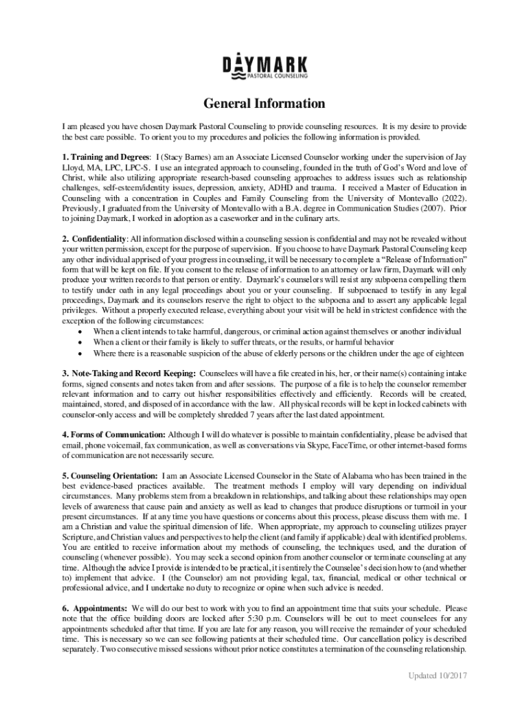 General Information I am pleased you have chosen Daymark Pastoral Counseling to provide counseling resources. It is my desire to provide the best care possible. To orient you to my procedures and