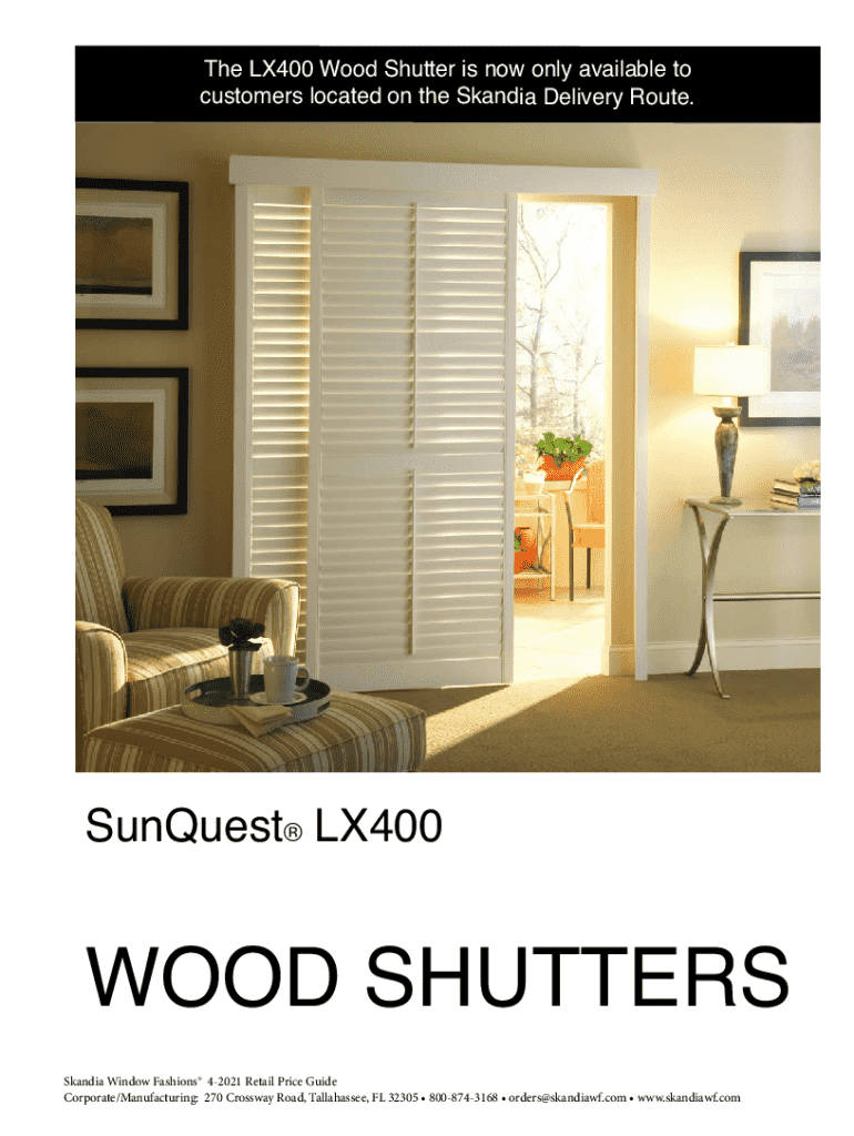 The LX400 Wood Shutter is now only available to customers located on the Skandia Delivery Route.SunQuest LX400WOOD SHUTTERSSkandia Window Fashions 42021 Retail Price Guide Corporate/Manufacturing: