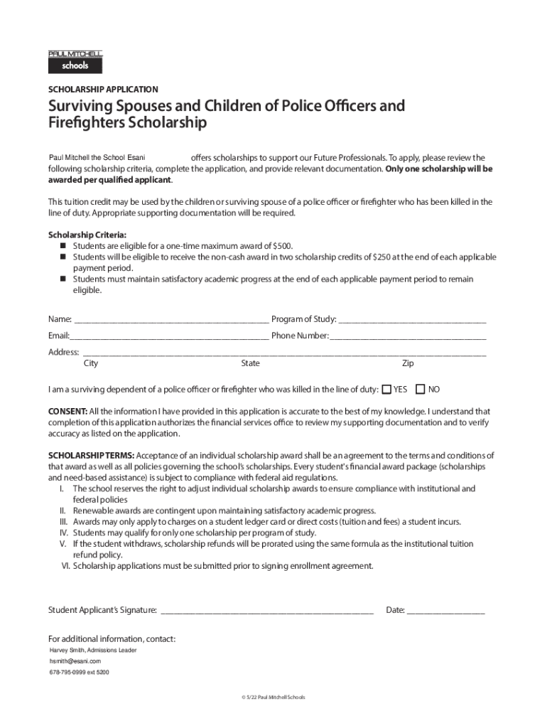 SCHOLARSHIP APPLICATIONSurviving Spouses and Children of Police Officers and Firefighters Scholarship Paul Mitchell the School Esanioffers scholarships to support our Future Professionals. To apply,