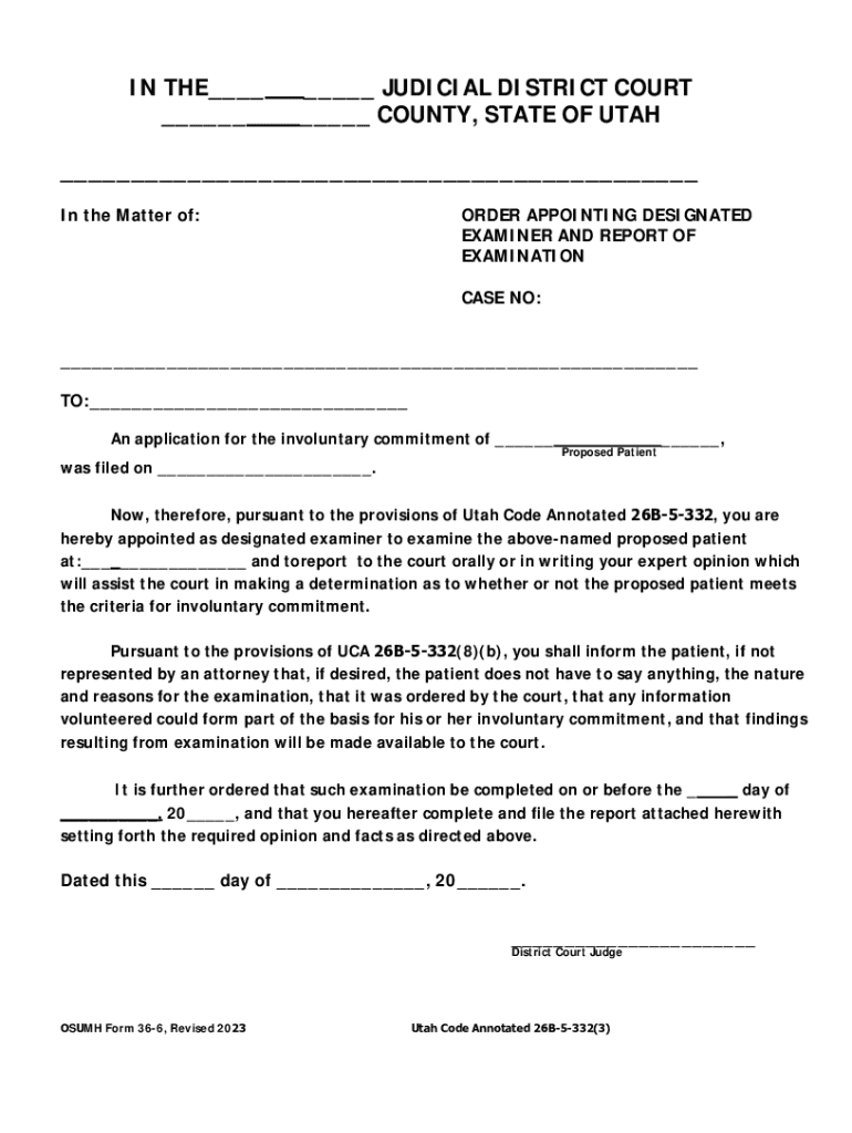 Get the free Form 36-6 State of Utah Order Appointing Designated Examiners and Report of Examination