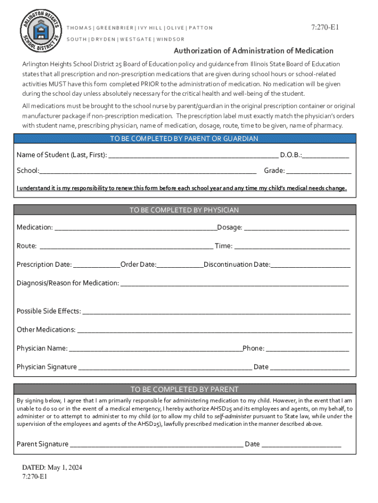 T H O M A S | G R E E N B R I E R | I V Y H I L | O L I V E | P A T T O N7:270E1S O U T H | D R Y D E N | W E S T G A T E | W I N D S OR Authorization of Administration of Medication Arlington Heights