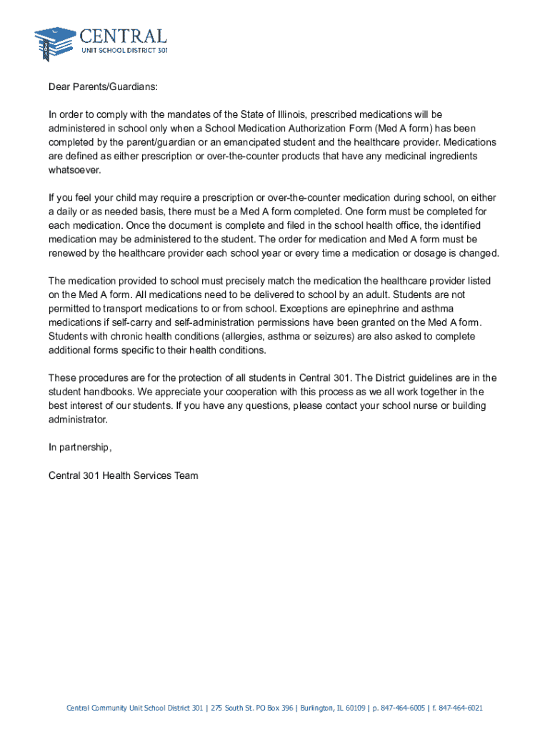 This form is required for administering prescribed or over-the-counter medications at school, ensuring compliance with Illinois regulations. Complete for each medication.